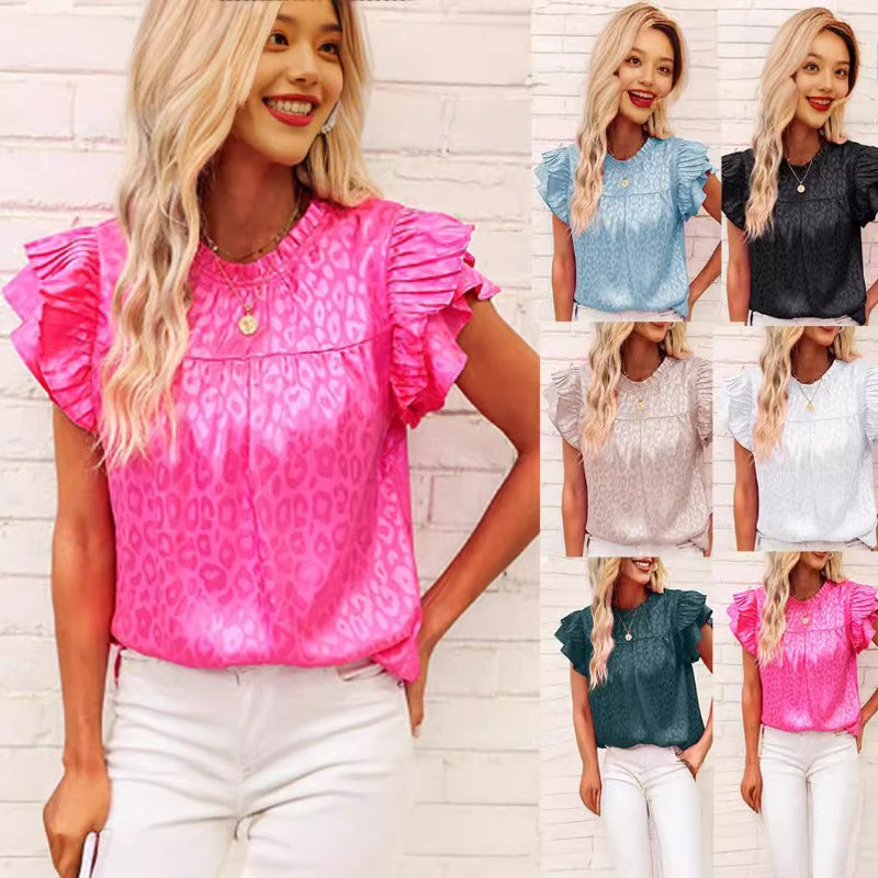 Wholesale Fashion Versatile Printed Ruffle Sleeve Wave Neck Top