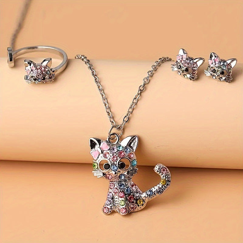 Wholesale Cartoon Color Rhinestone Cat Alloy Earrings Ring Necklace