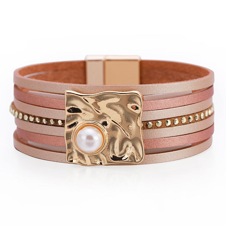 Wholesale Bohemian Multi-layered Leather Buckle with Pearl Bracelet