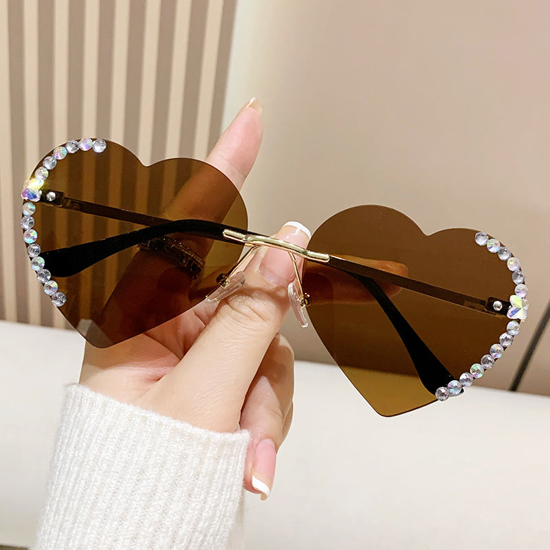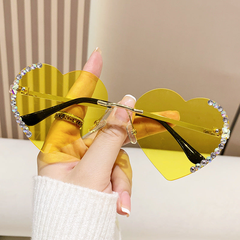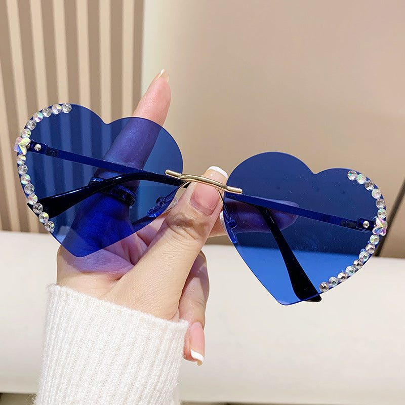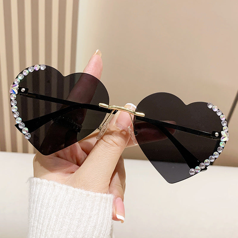 Wholesale Travel Driving Metal Heart Frameless Cut Edge Diamond Heart Sunglasses