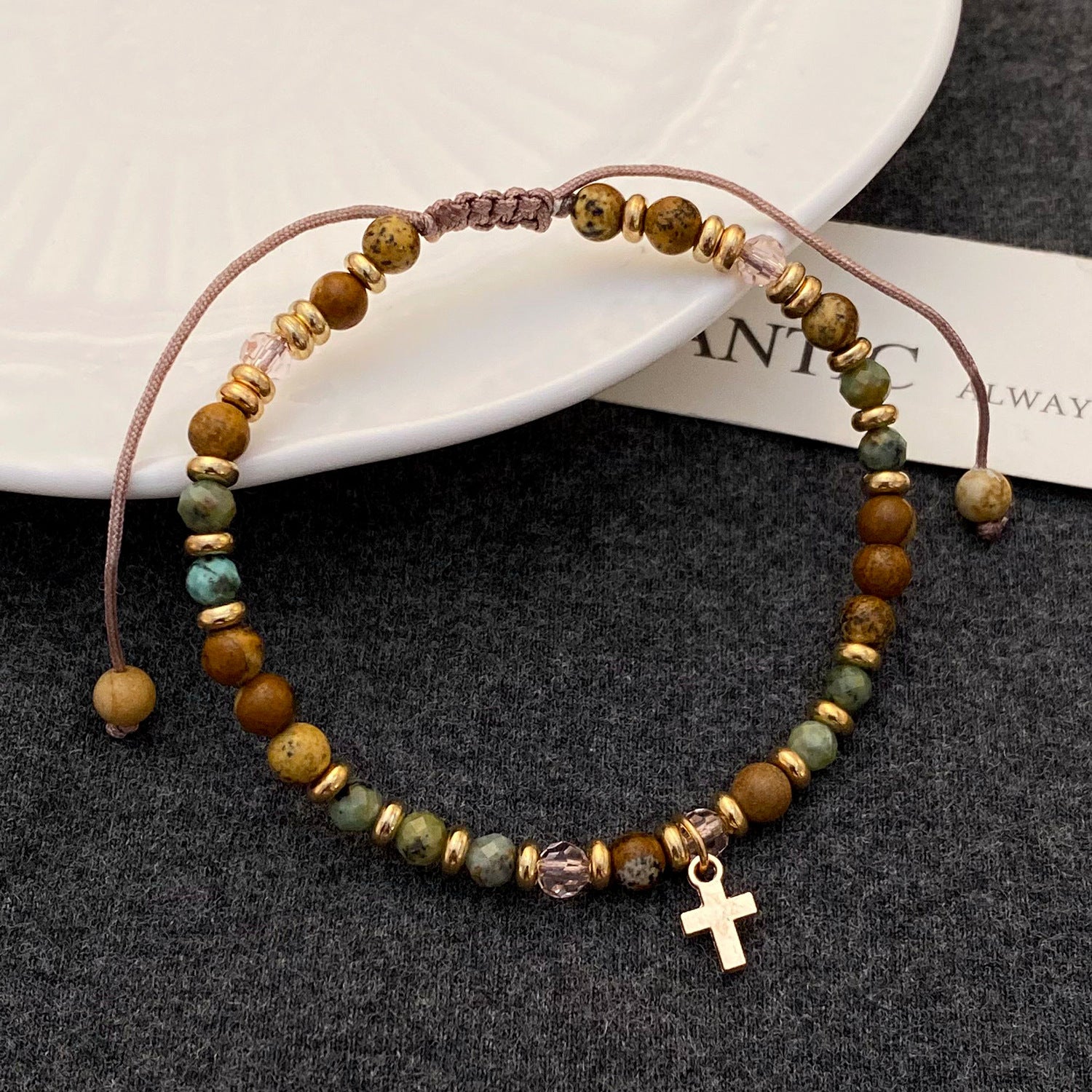 Wholesale Bohemian colored gemstone beaded cross bracelet braided pull-out hand jewelry