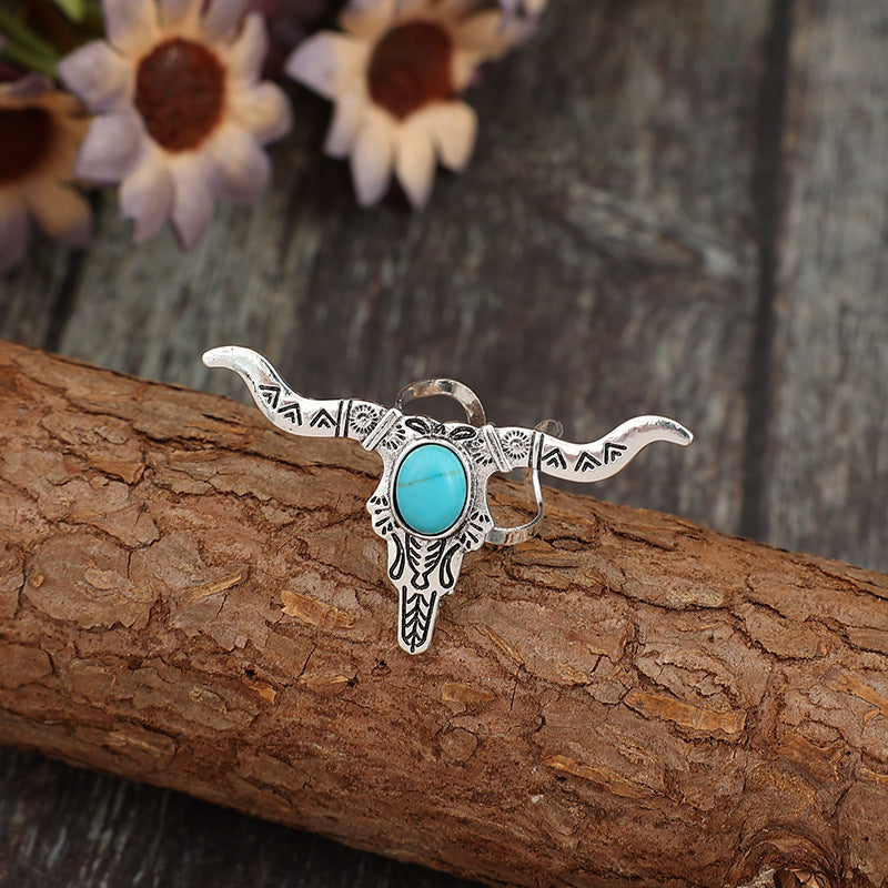 Wholesale Retro ethnic style bull head carved inlaid turquoise alloy ring