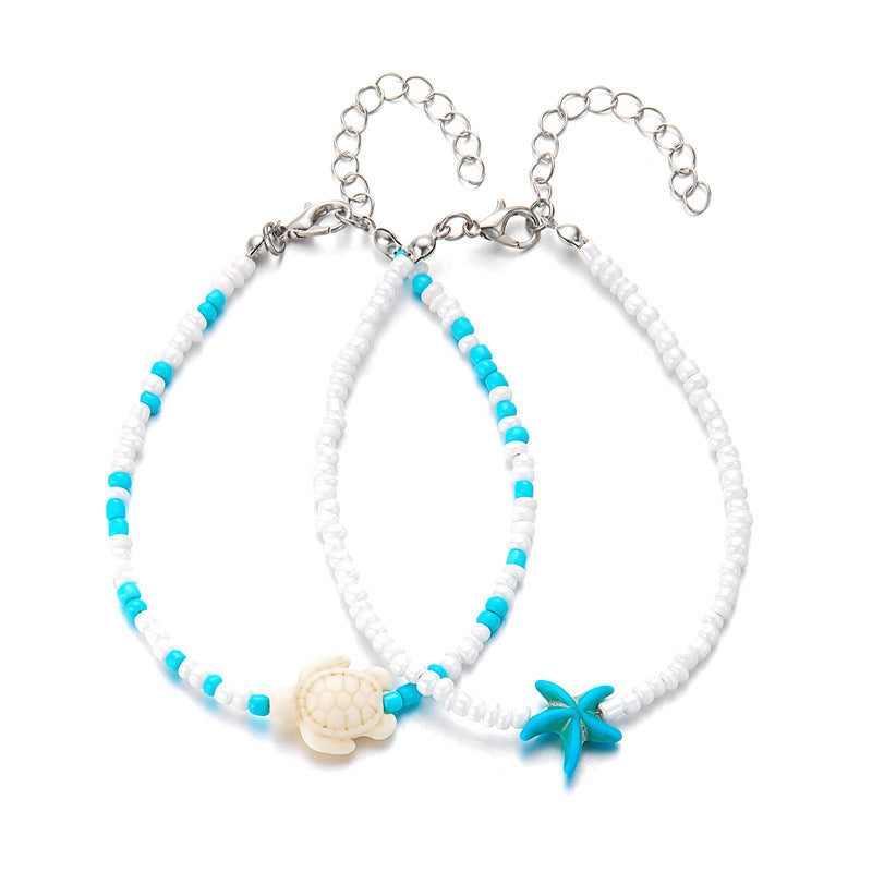 Wholesale Vacation Ocean Style Rice Pearl Stacked Starfish and Turtle Anklet