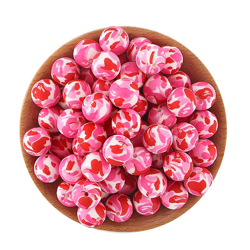 Wholesale 50pcs 15mm Water Transfer Red Camouflage Pattern Silicone Beads