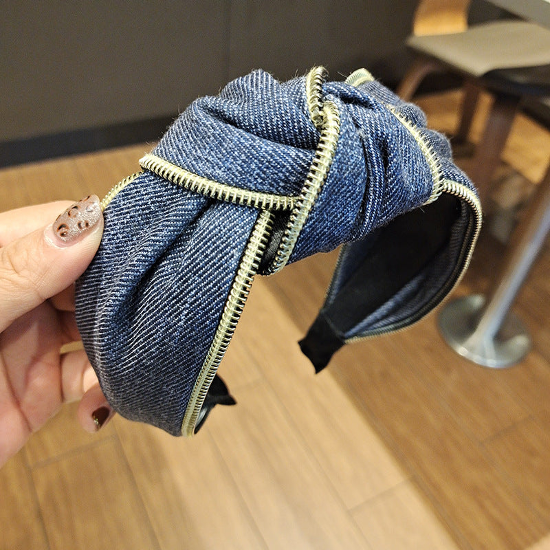 Wholesale Denim Wide Brim Fabric Zipper Headband