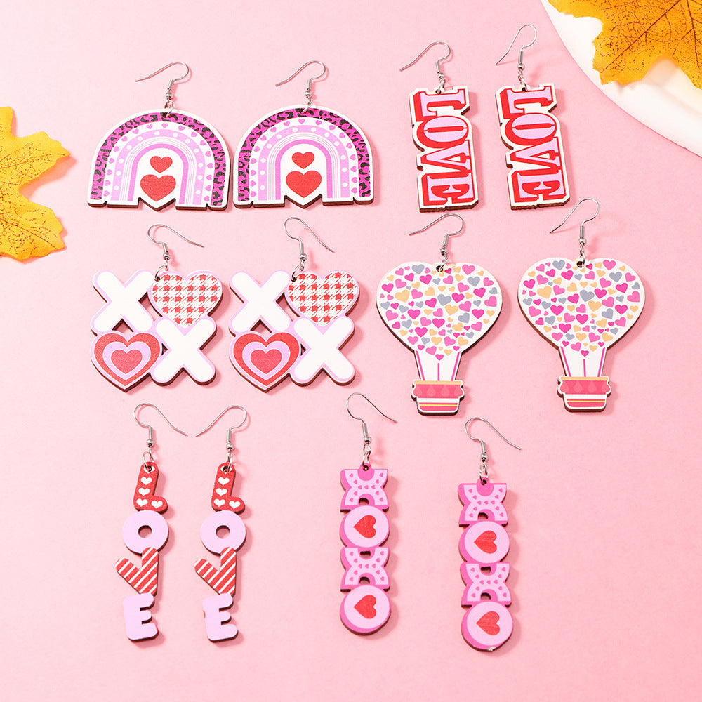 Wholesale Valentine's Day Pink Printed Love Heart-shaped Wooden Earrings