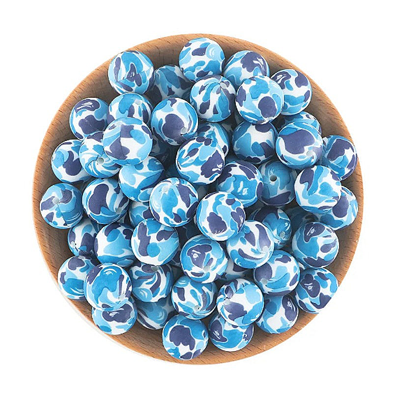 Wholesale 50pcs 15mm Water Transfer Blue Camouflage Pattern Silicone Beads