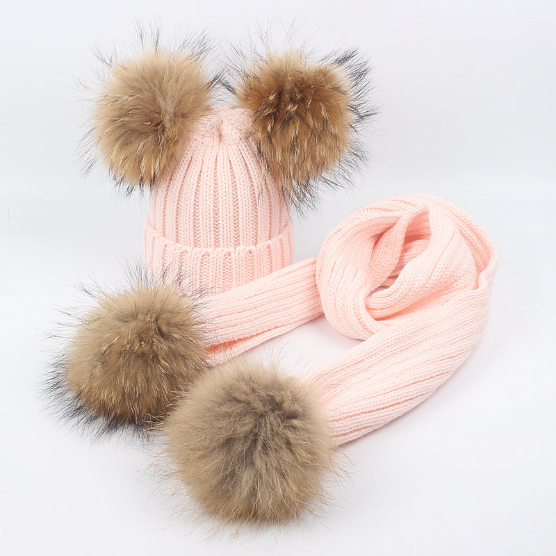 Wholesale Autumn and Winter Children's Double Wool Ball Knitted Hat and Scarf Set