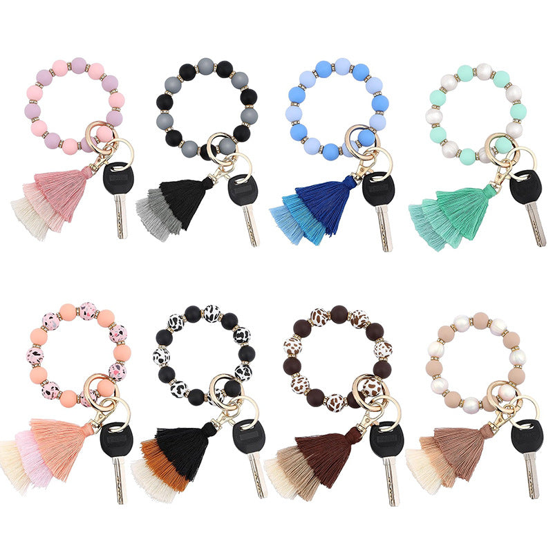 Wholesale Cow Print Leopard Print Tassel Silicone Beaded Wrist Keychain