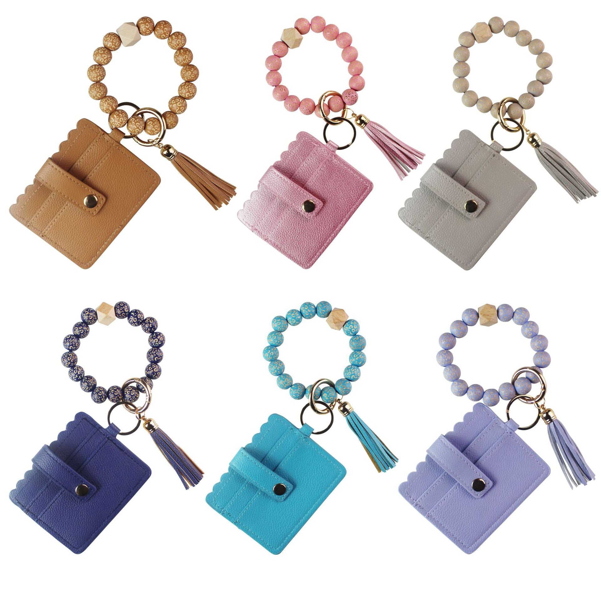 Wholesale Leopard Pattern Wood Bead Card Bag Tassel Wrist Keychain
