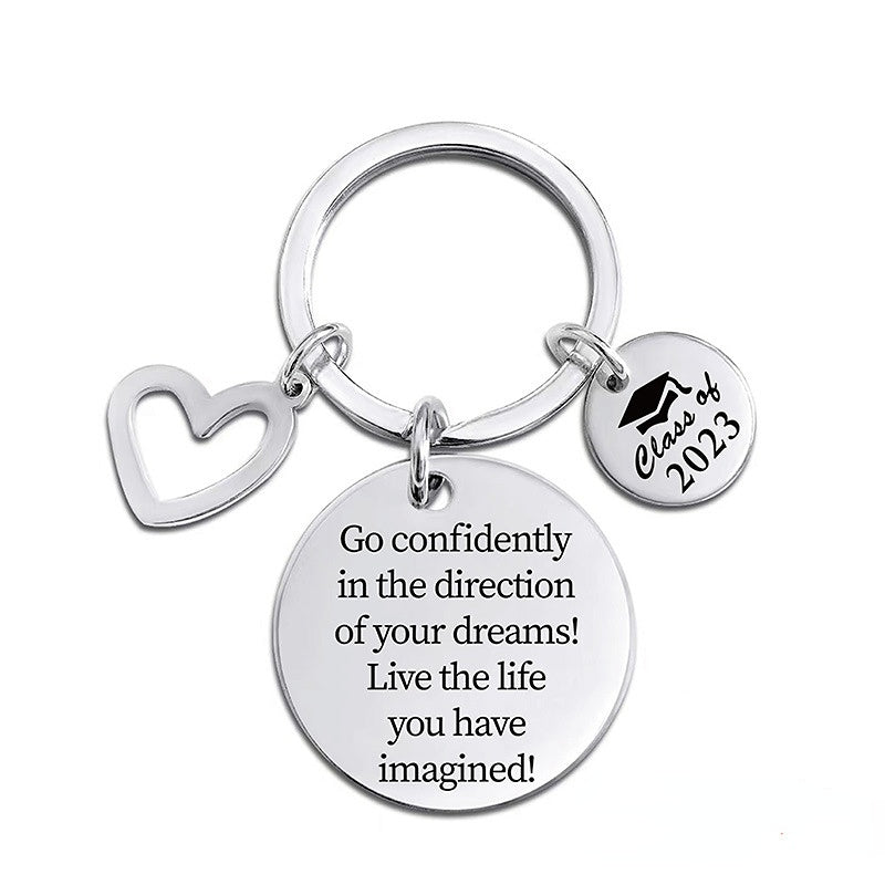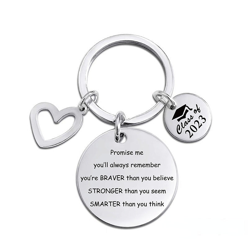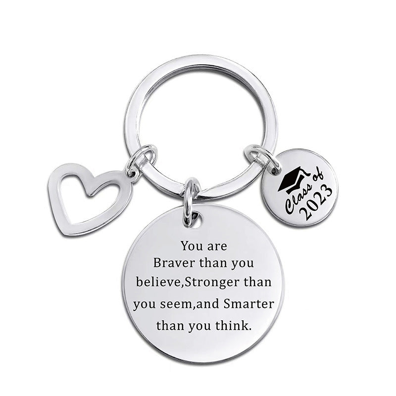 Venta al por mayor, regalo de temporada de graduación, letras, tarjeta redonda de acero inoxidable, llavero de corazón