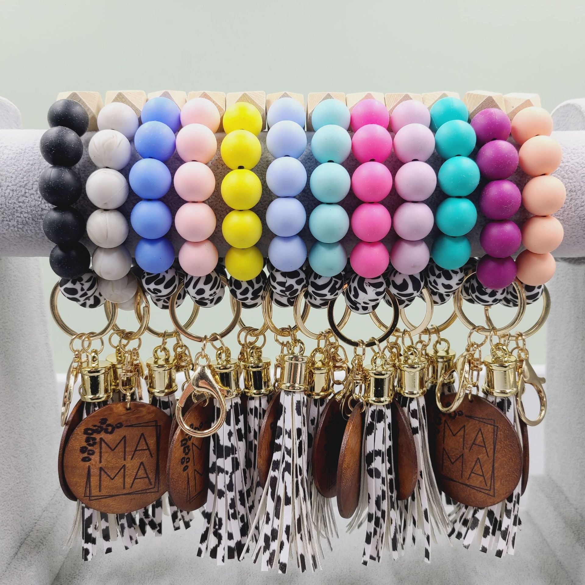 Kehychain de muñeca con cuentas de muñeca de silicona de la marca de la marca de madera de madera.