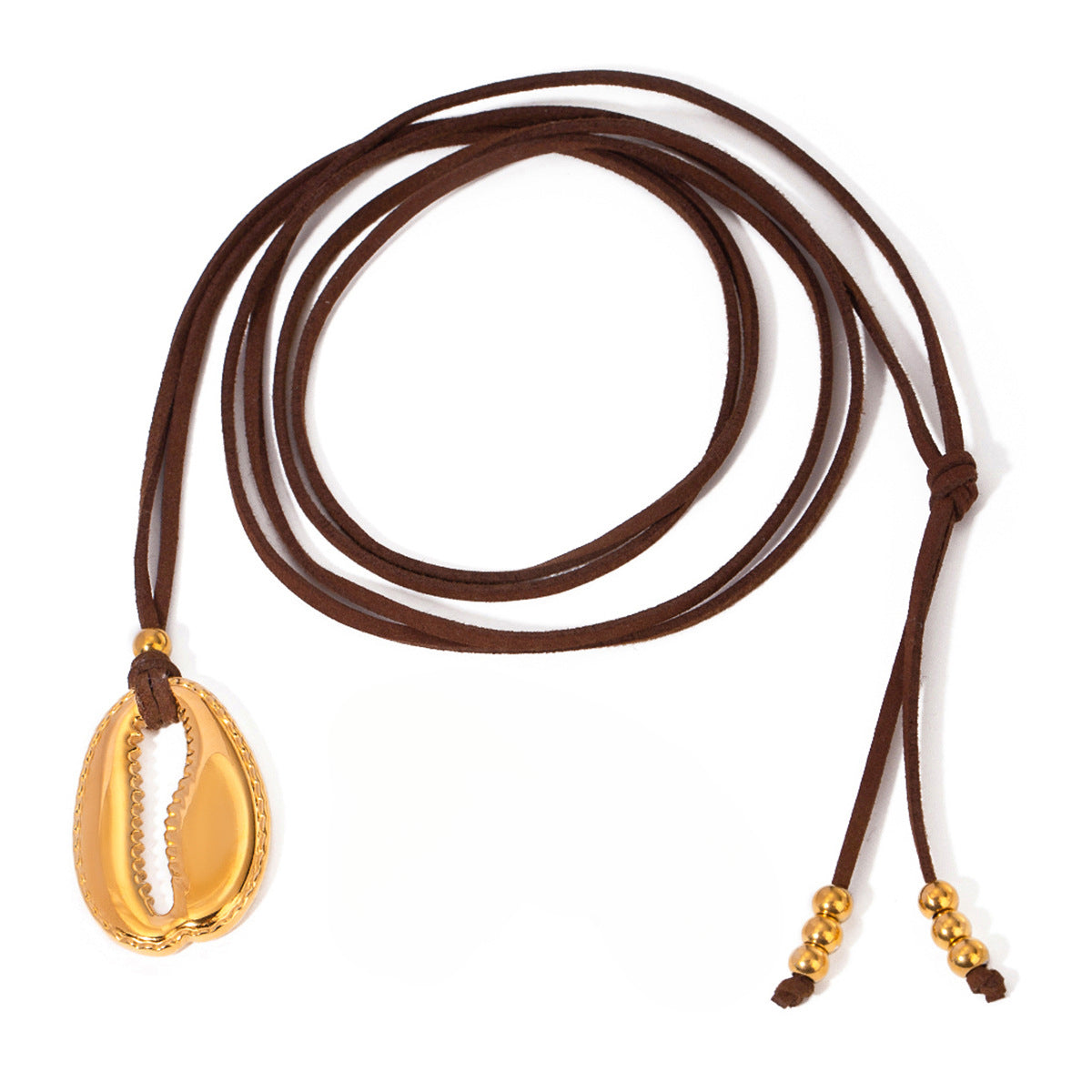Wholesale French 18k Gold Stainless Steel Large Tooth Shell Pendant Brown Velvet Rope Necklace