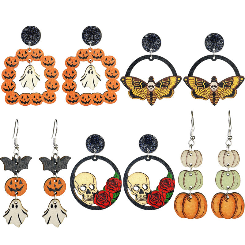 Wholesale 2 Pairs/pack Halloween Wooden Bohemian Ghost Pumpkin Skull Flower Stitching Earrings