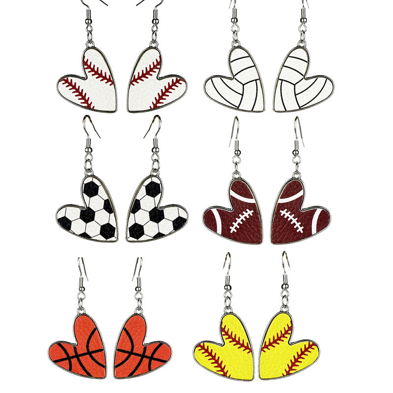 Wholesale 2 Pairs/pack Sports Season Football Rugby Basketball Baseball Leather Metal Heart Earrings