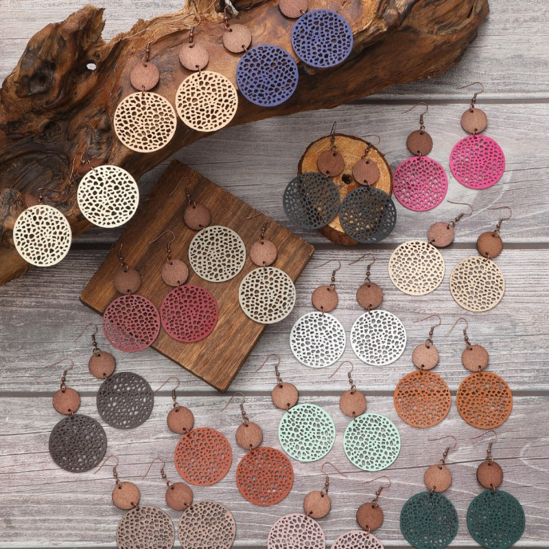 Wholesale Hollow Wood Piece Combination Leather Round Mesh Earrings