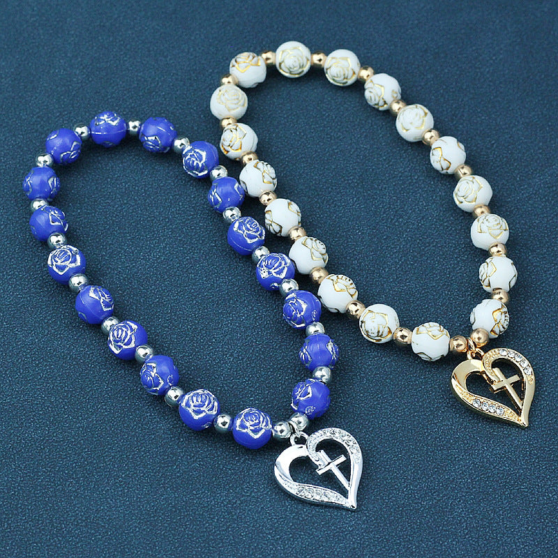 Wholesale Rose Beaded Heart Cross Couple Bracelet
