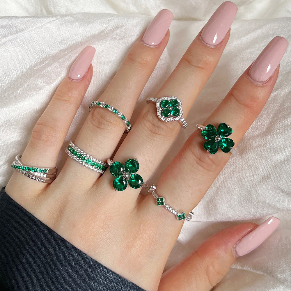 Wholesale S925 Sterling Silver Green Four-leaf Clover Zircon Inlaid Ring