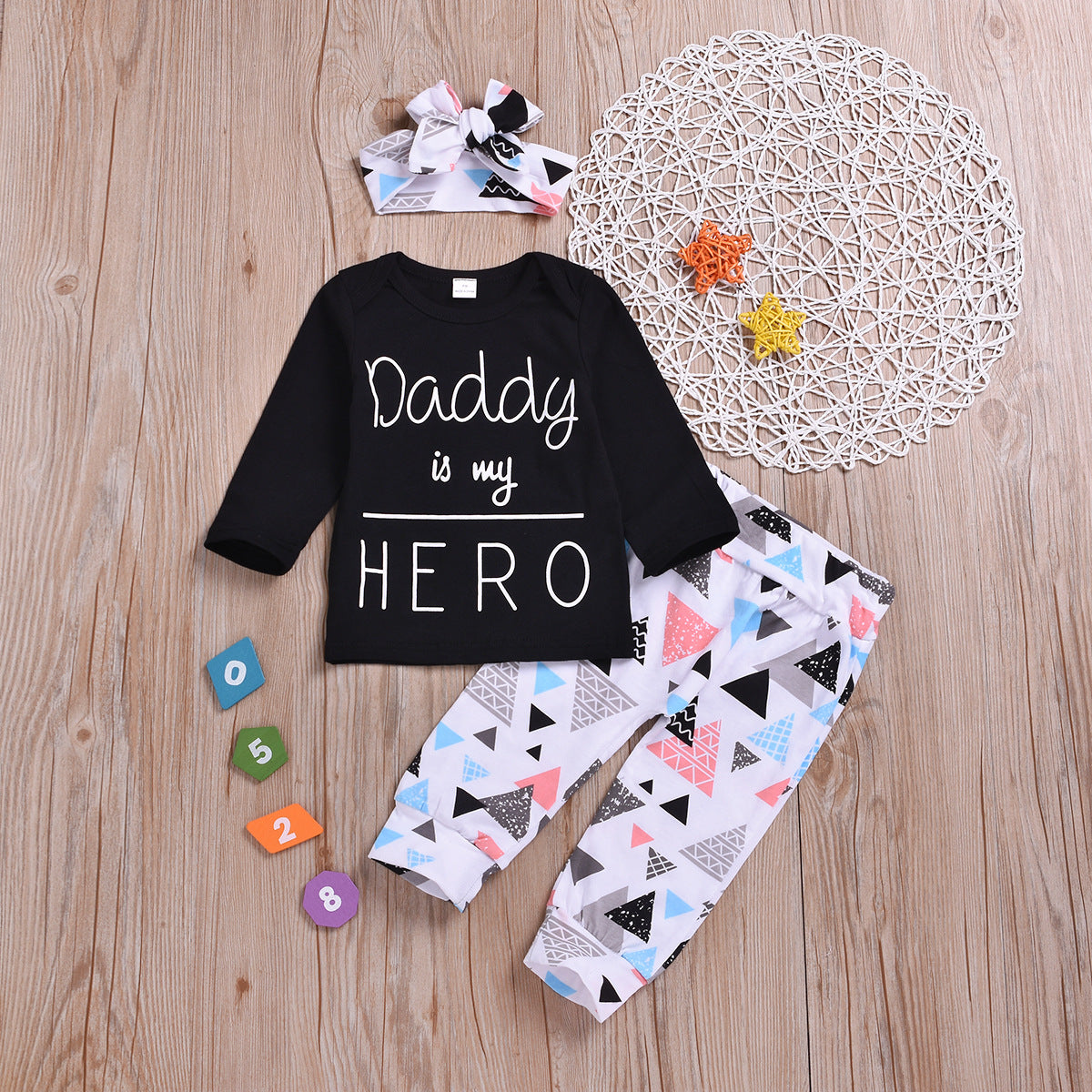 Wholesale Cotton Children's Letter Printed Long Sleeved Top Triangle Printed Pants Headband Three Piece Set