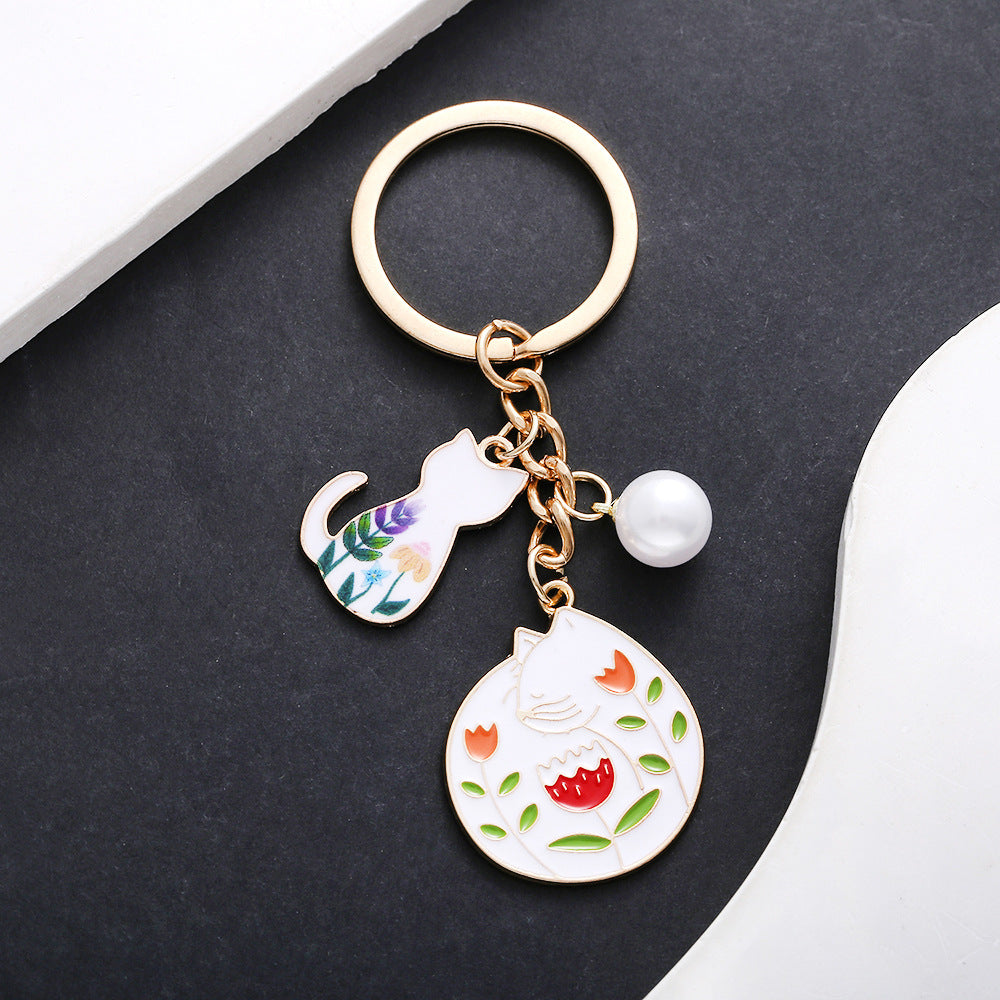 Wholesale oil drop cartoon cute flowers white cat pearl keychain metal jewelry pendant manufacturers