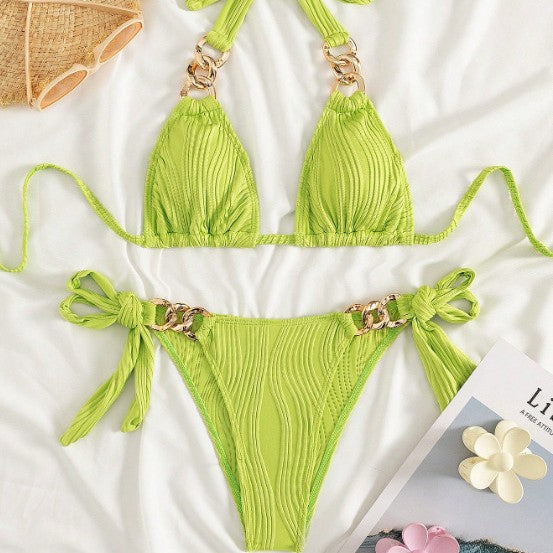 Wholesale Corrugated Cloth Metal Ring Strap Bikini Sexy Beach Halter Women's Swimsuit