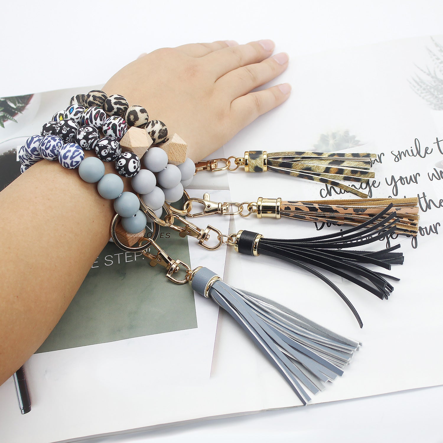 Llavero de muñeca con cuentas de silicona con estampado de leopardo al por mayor