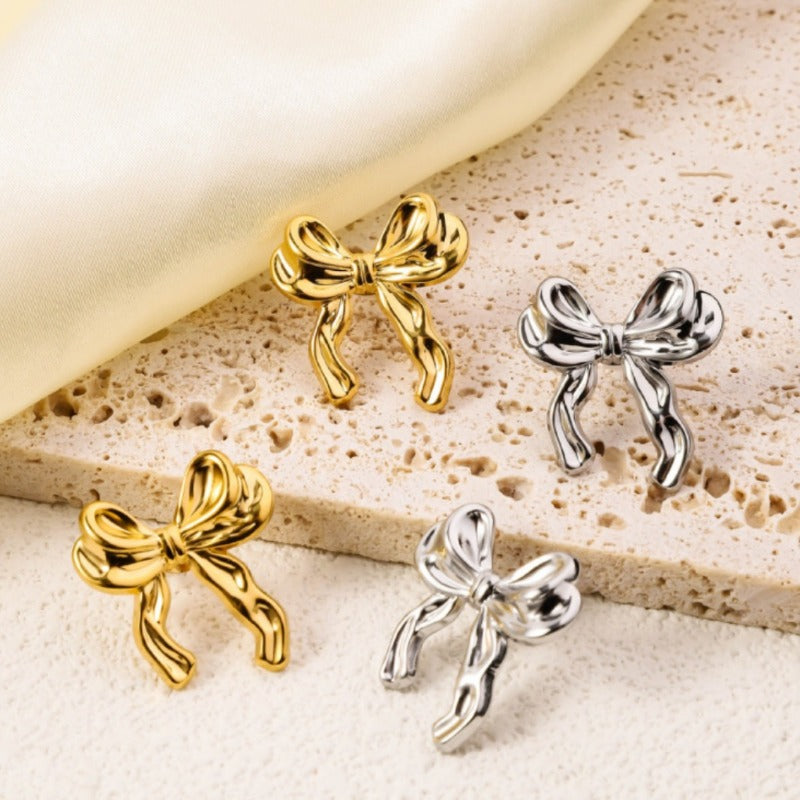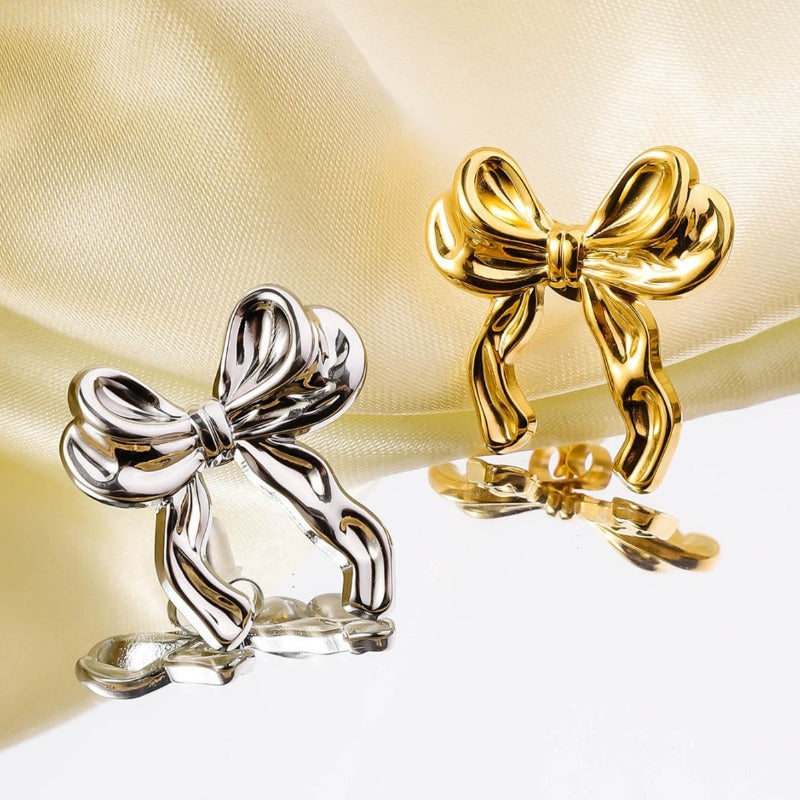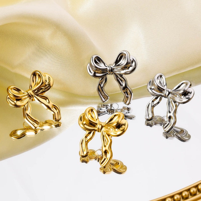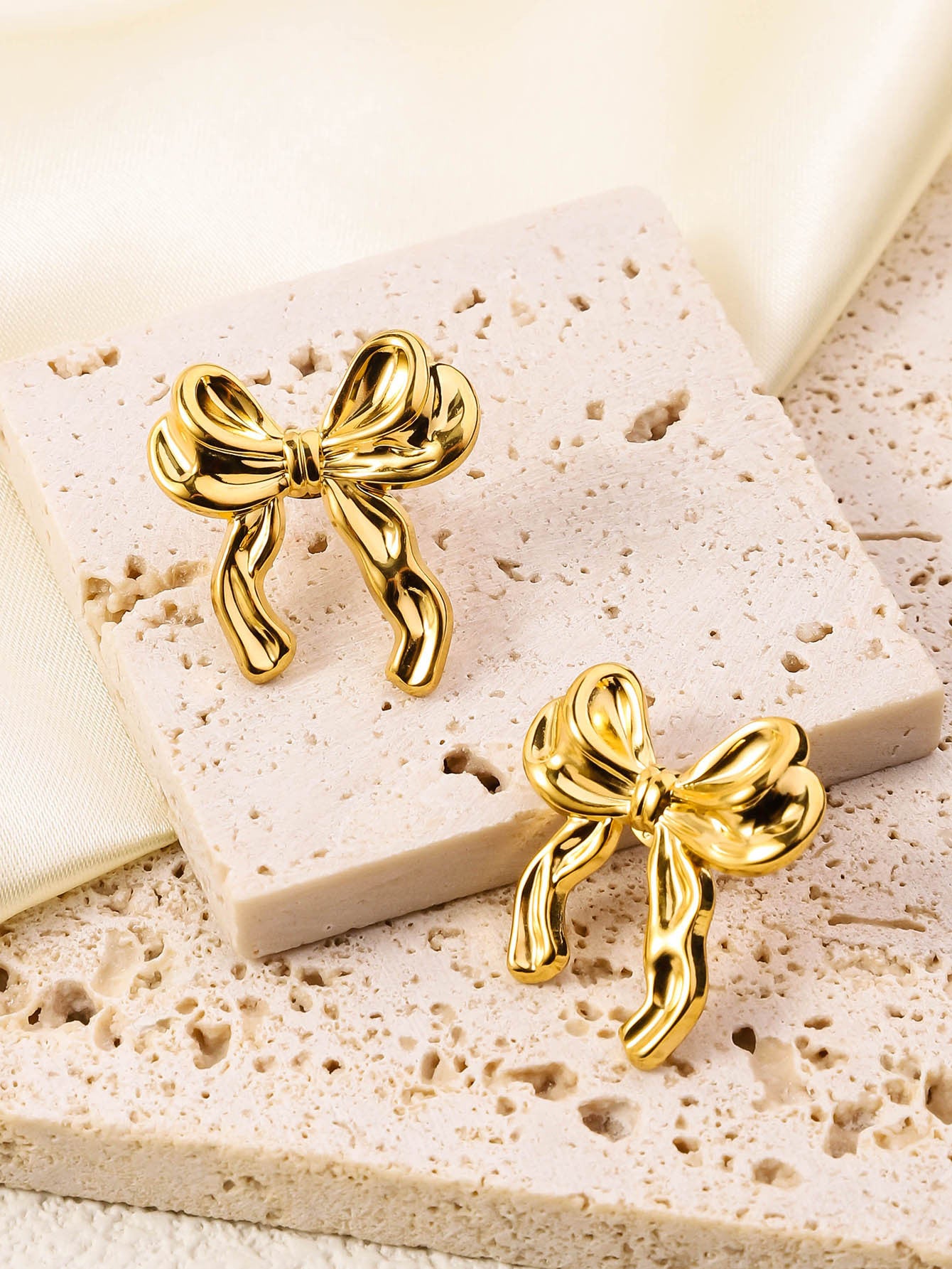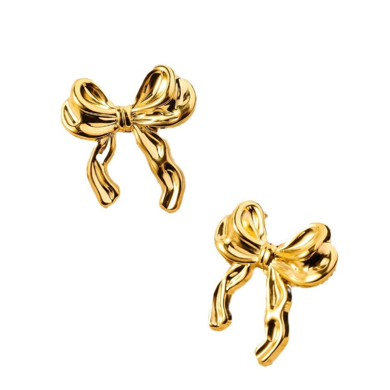 Wholesale Retro Premium Double layered Bow Stainless Steel 18k Genuine Gold Plated Color Preserved Earrings