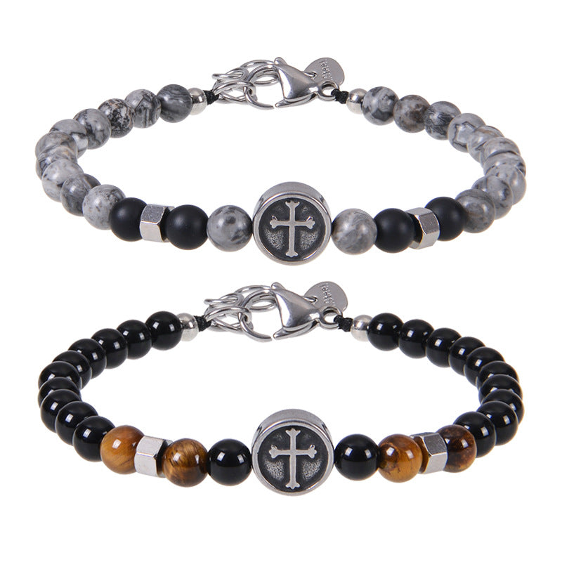 Wholesale Vintage Stainless Steel Cross Men's Natural Stone Beaded Bracelet