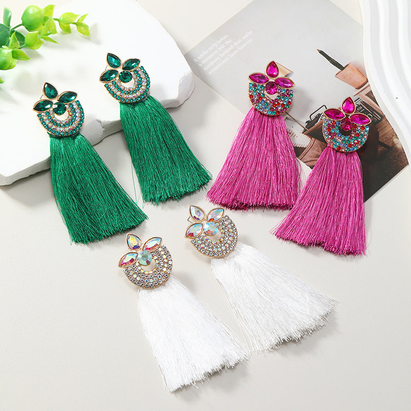 Wholesale Alloy Diamond Inlaid Flower Long Ring Tassel Earrings
