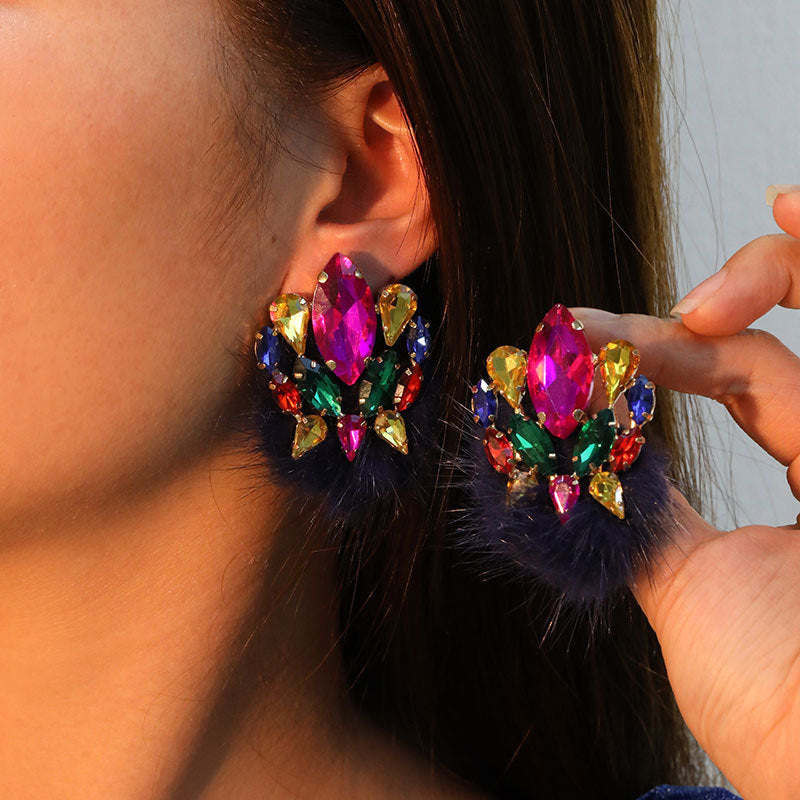 Wholesale Plush Ball Colorful Rhinestone Earrings