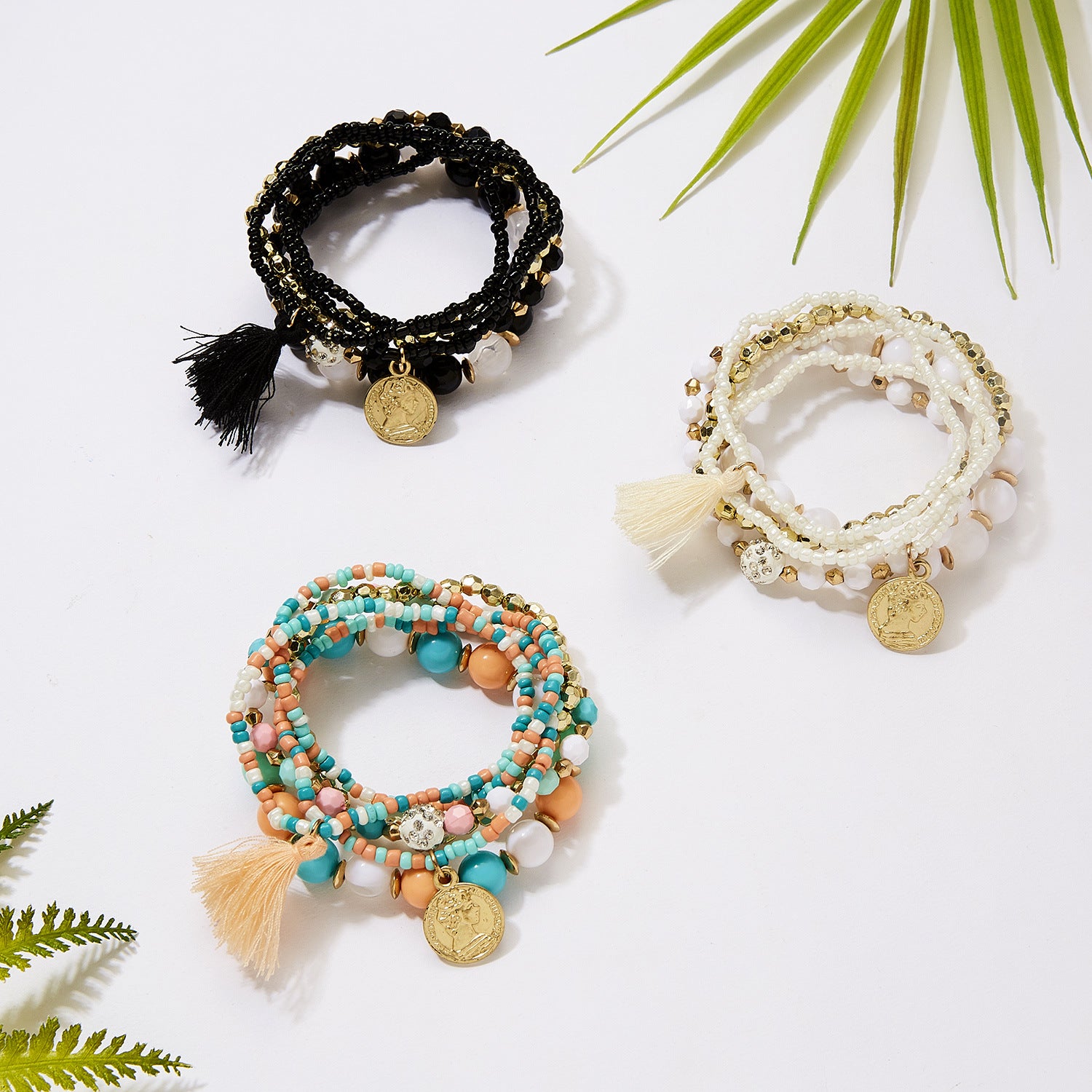 Wholesale 6pcs Beauty Head Coin Tassel Beaded Multilayer Bracelet
