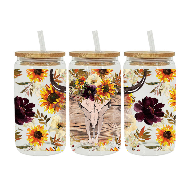 Wholesale Western style cow head boots sunflower 16oz Cup UV DTF Wraps