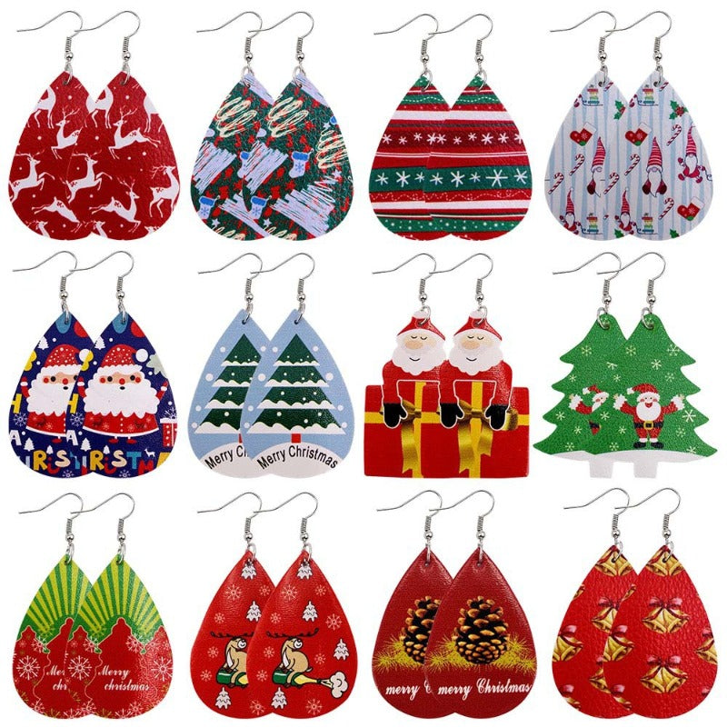 Wholesale Christmas Tree Bells Santa Claus Elk Leather Earrings