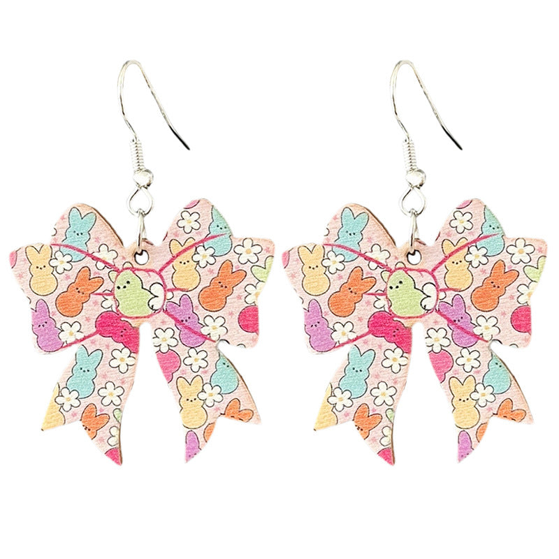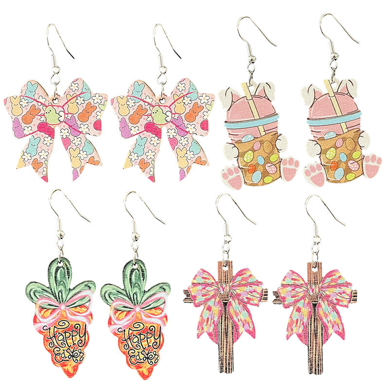 Wholesale 2pairs/pack Easter Wooden Cute Bow Colorful Bunny Cross Carrot Pattern Earrings