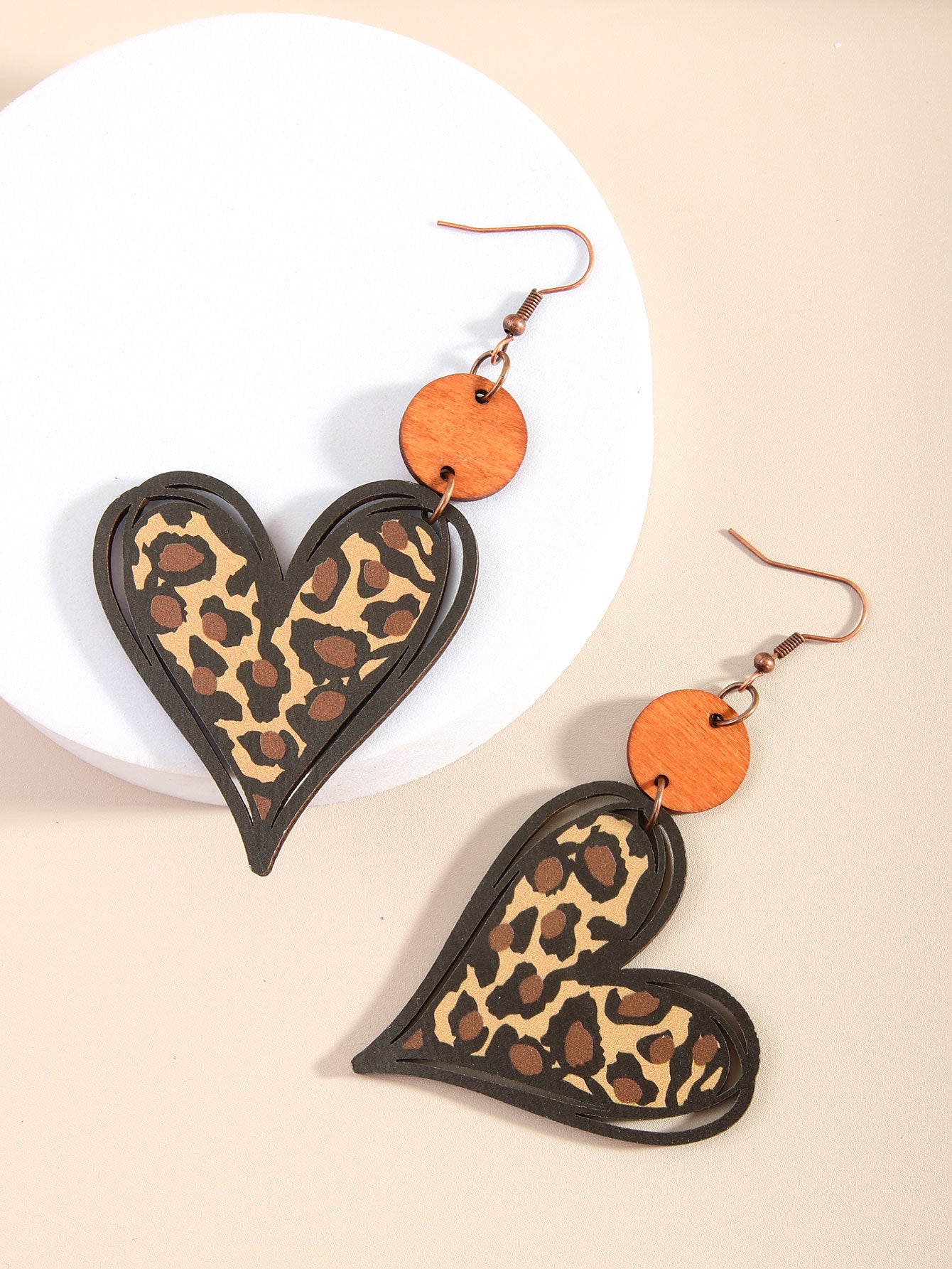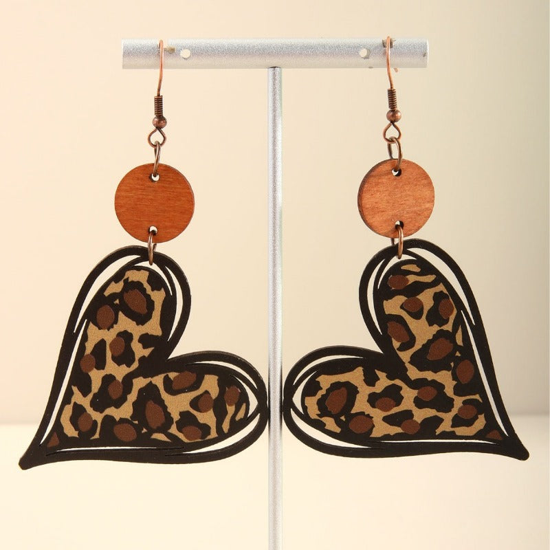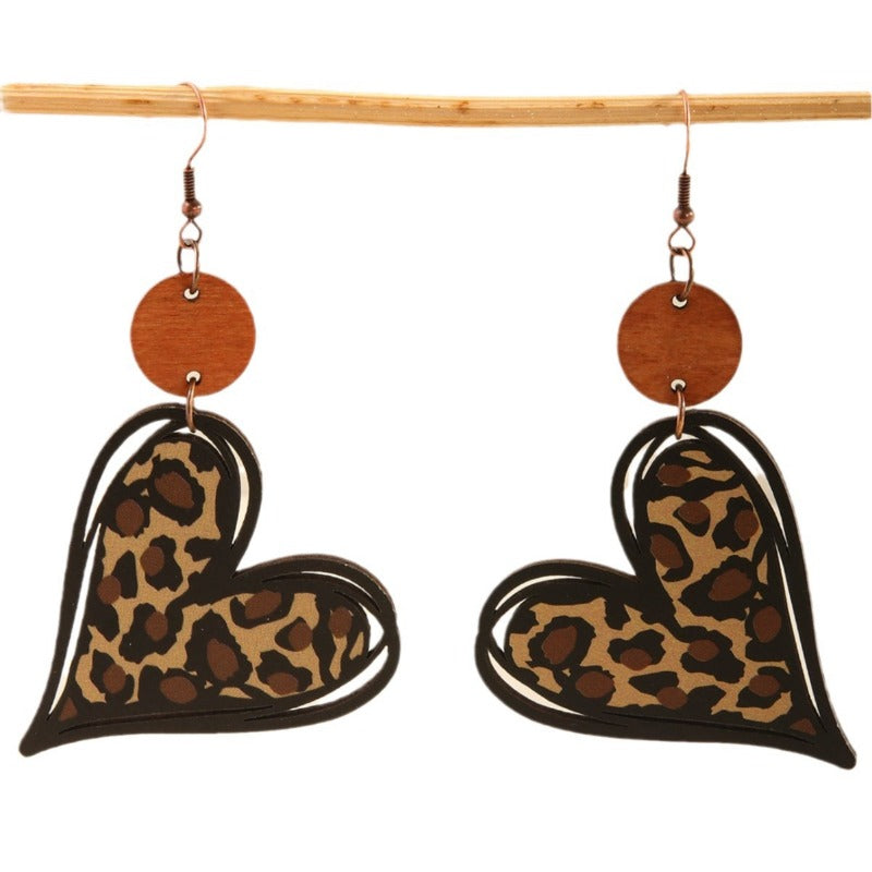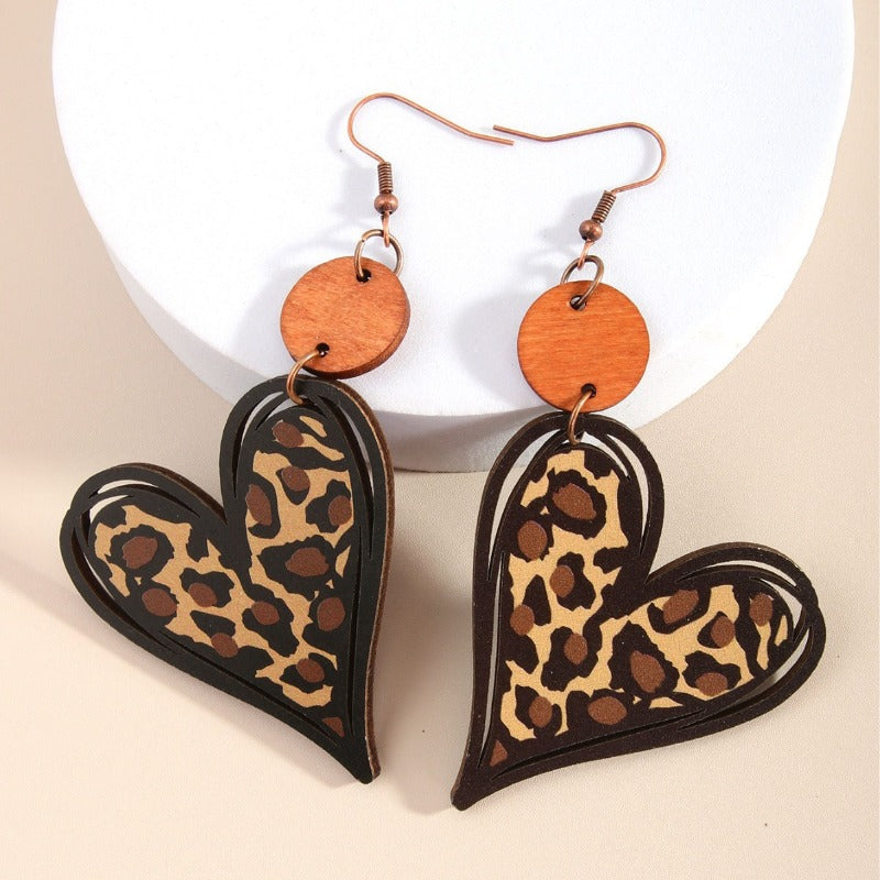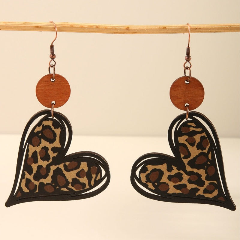 Wholesale European and American Hollow Leopard Print Wooden Heart-shaped Round Wooden Pieces Women's Earrings