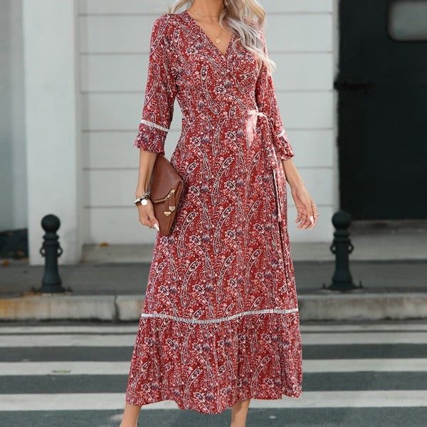 Wholesale Cotton Hollowed Out Lace V-neck 3/4 Sleeve Tie Waist Dress