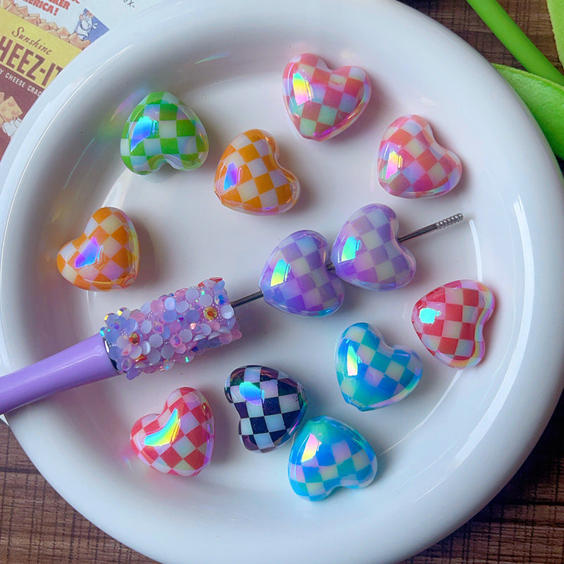 Wholesale 10pcs/pack Printed checkered heart-shaped bead Acrylic Beads
