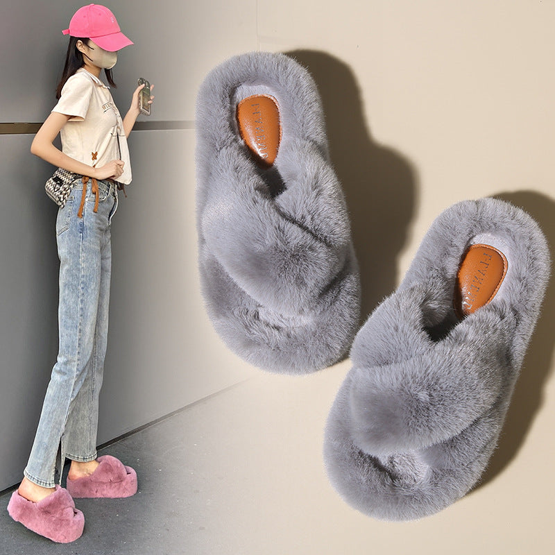 Wholesale 2023 Thick 6CM Bottom with Velvet Cross Two Solid Color Plush Slippers