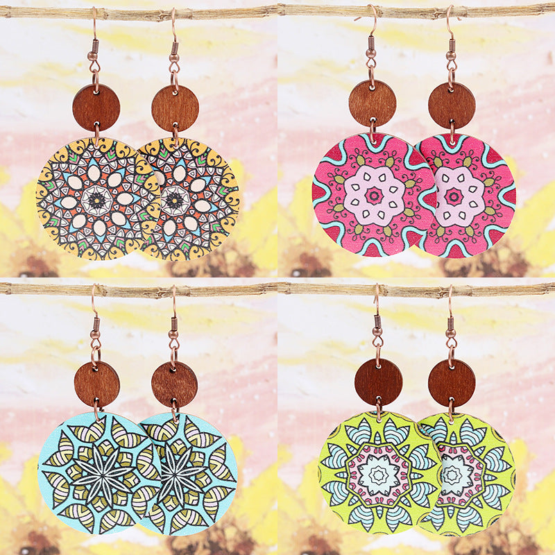 Wholesale 2pairs/pack Bohemian Style Spliced Mandala Flower Wooden Earrings
