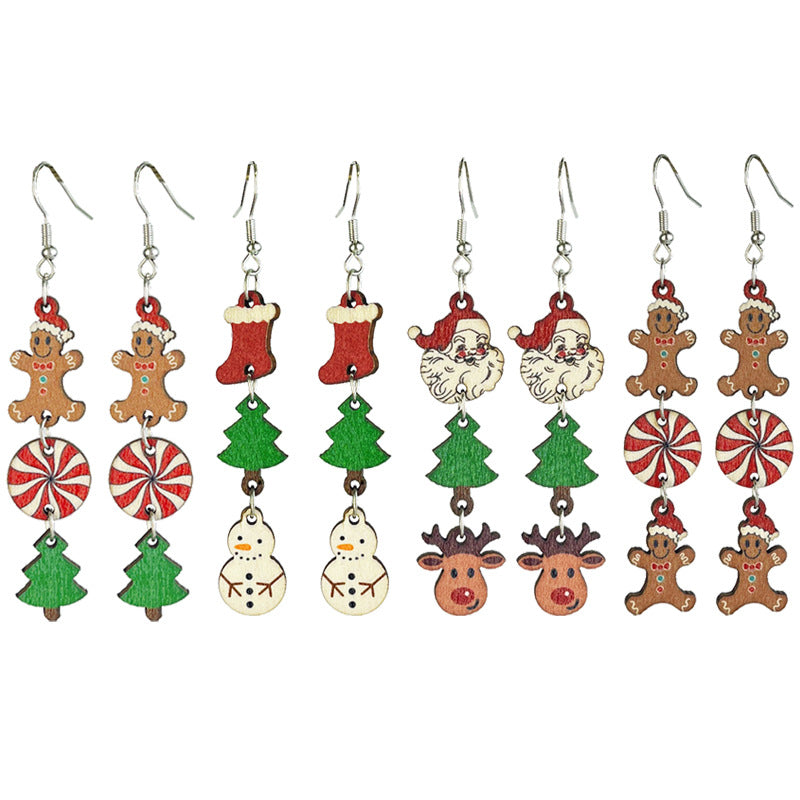 Wholesale 2pairs/pack Christmas Wooden Gingerbread Man Christmas Tree Snowman Atmosphere Fawn Drop Earrings
