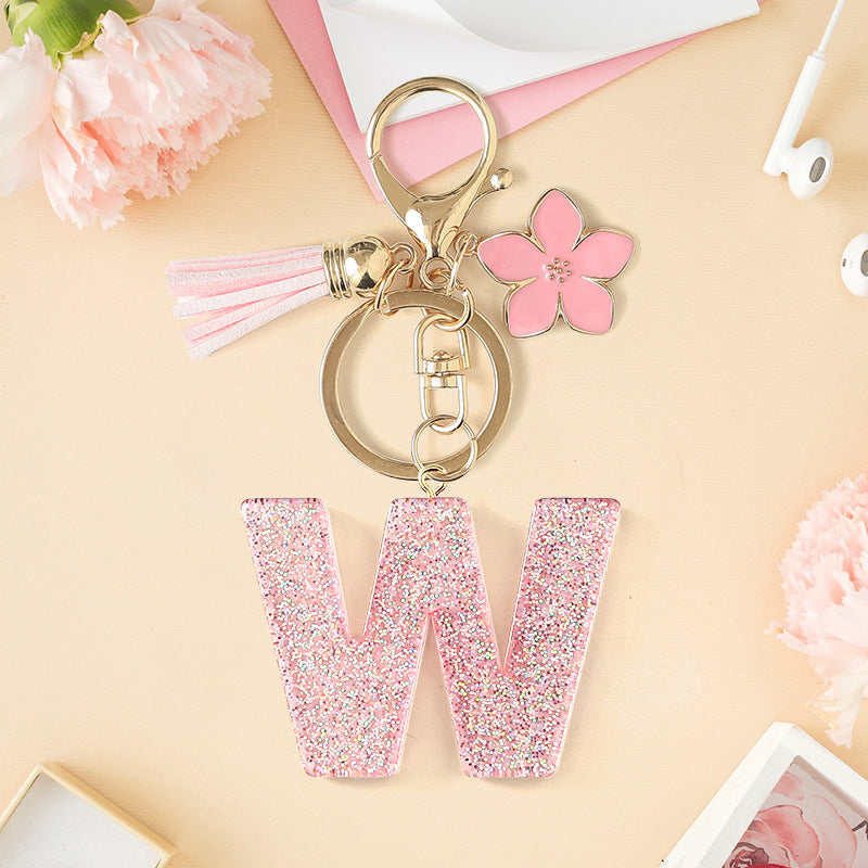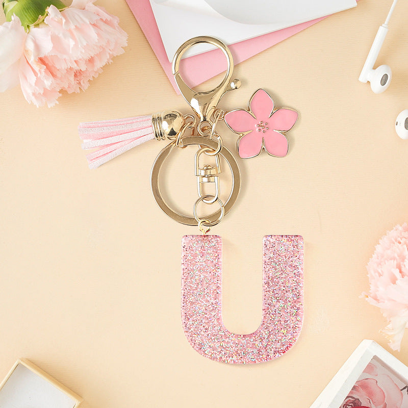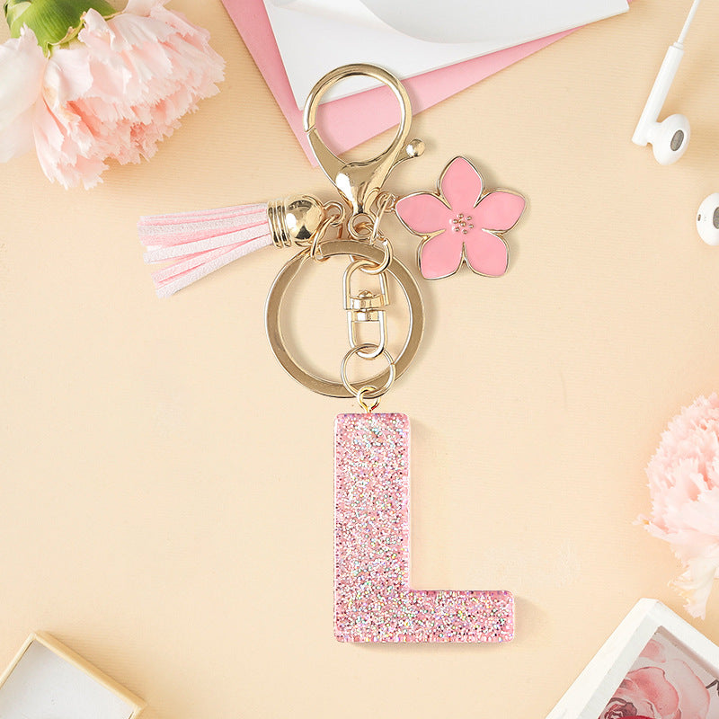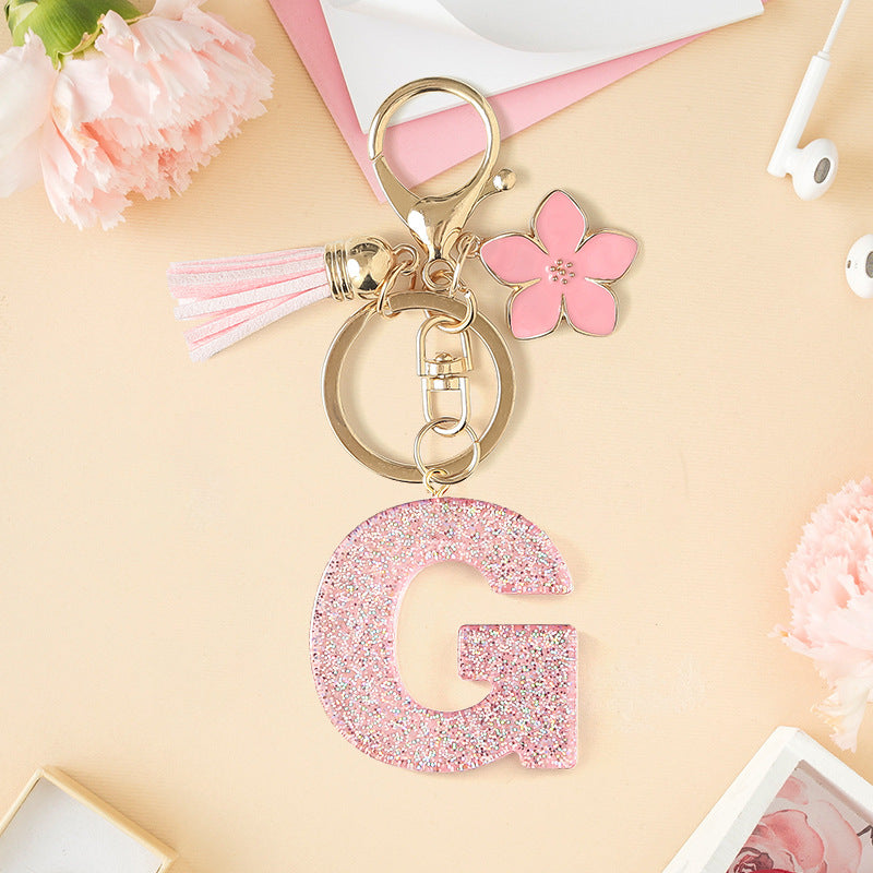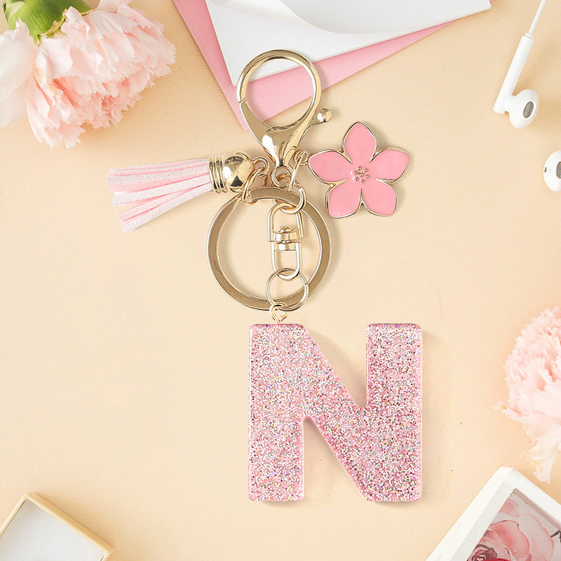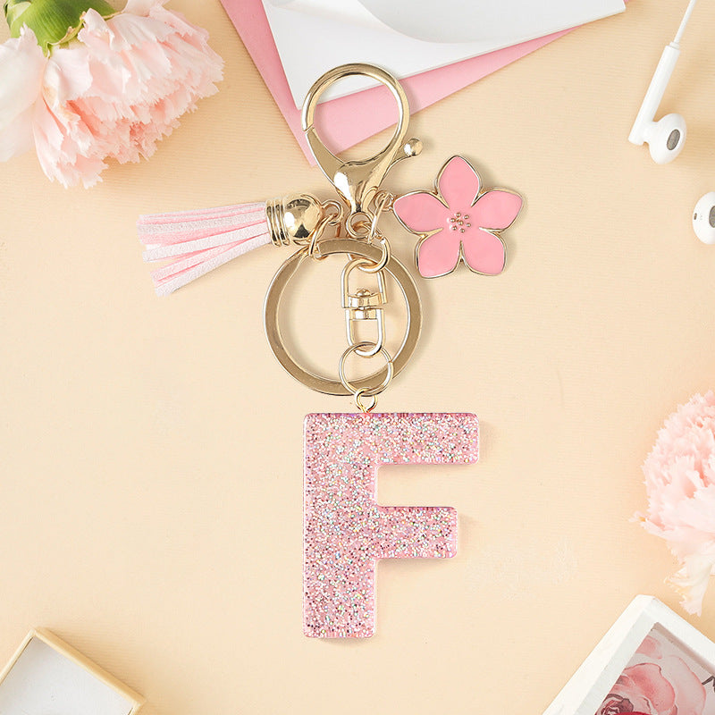 Wholesale Pink 26 letter Sparkling Pink Flower Tassel Keychain