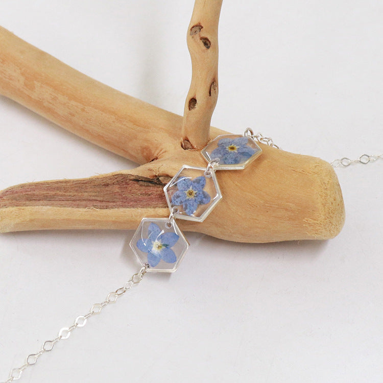 Wholesale 6pcs Sterling Silver Hexagonal Blue Three Forget-me-not Bracelet