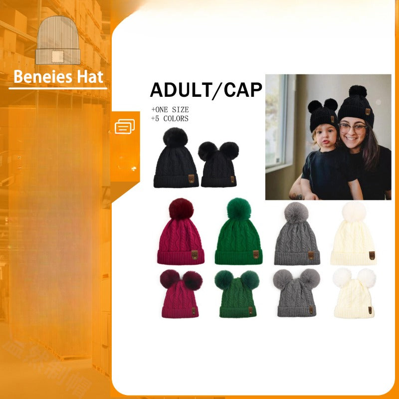 Wholesale Autumn and Winter Fleece Leather Label MINI Double Wool Ball Outdoor Warm Detachable Knitted Hat
