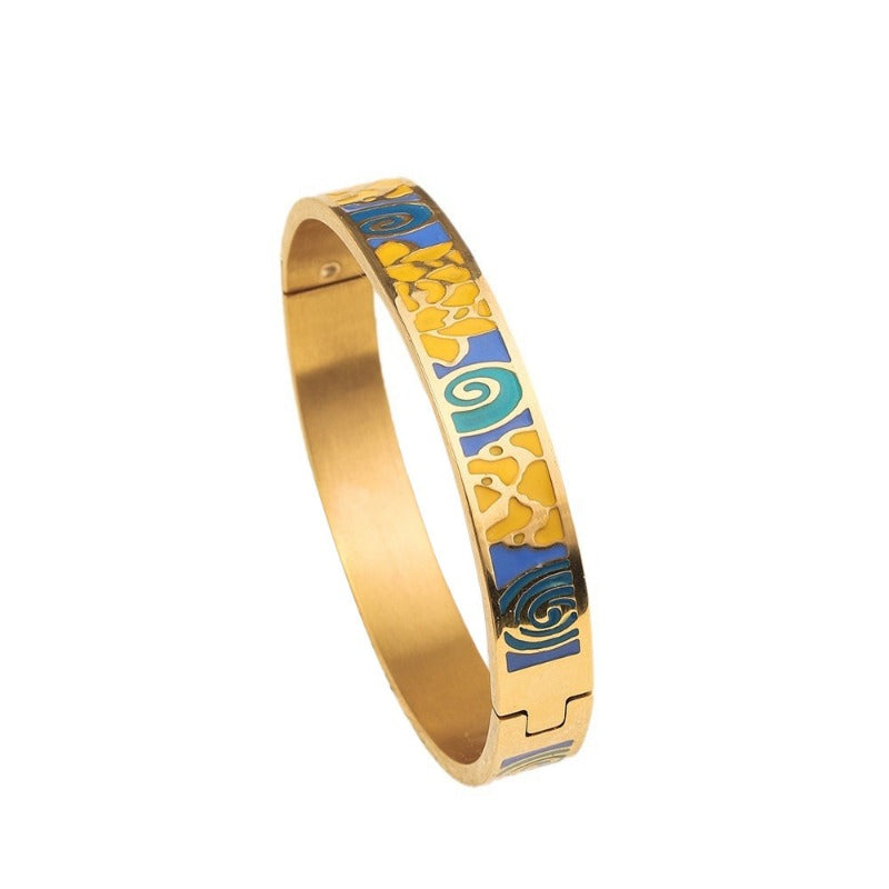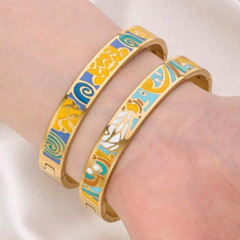 Wholesale Drop Glazed Enamel Wide Edged Patterned Stainless Steel 18k Genuine Gold Electroplated Titanium Steel Bracelet