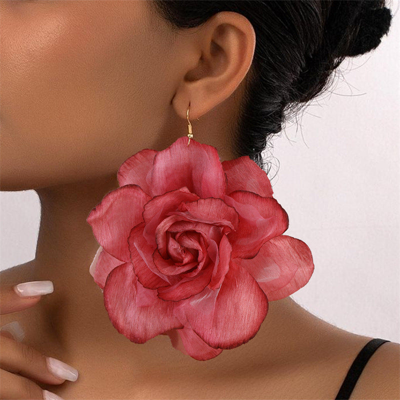Wholesale EZ5486 Cross-border European and American Imitation Rose Silk Flower Gradient Three-dimensional Mesh Flower Pendant Women's Earrings Valentine's Day Jewelry