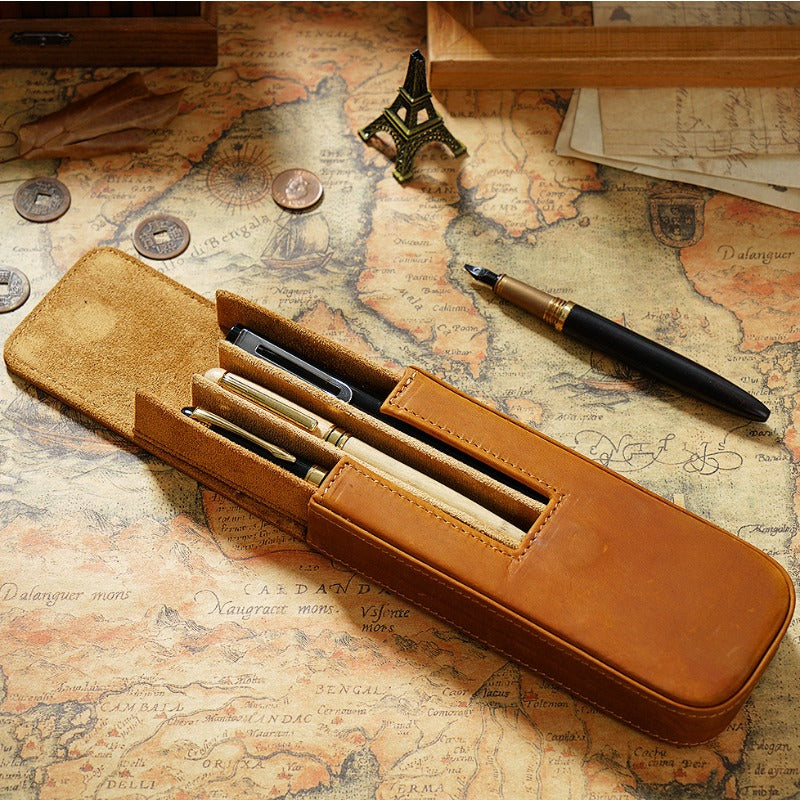 Wholesale Crazy Horse Leather 3-Pack Handmade Magnetic Drawer Pen Bag