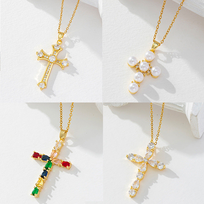 Wholesale Gilded Cross Geometry Zircon Vintage Pearl Necklace