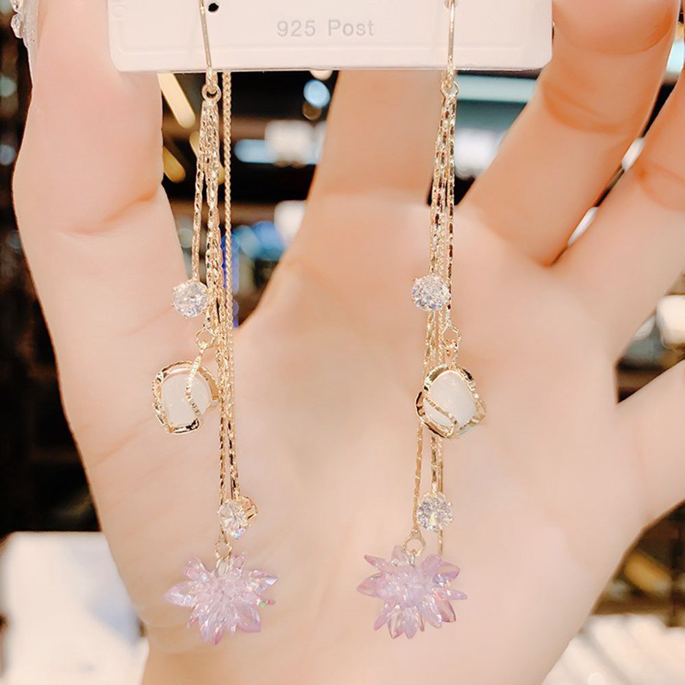Wholesale S925 Silver Needle Ice Flower Crystal Cat's Eye Stone Tassel Earrings